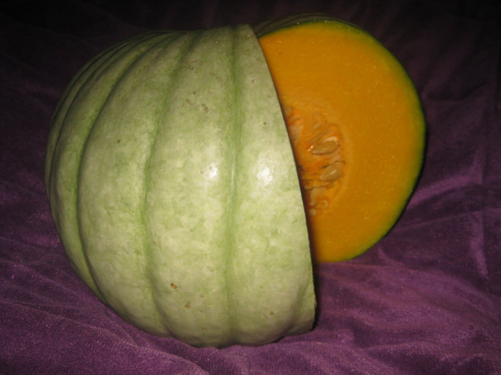 Upon her return the pumpkin was a wonderful size and completely ripe. It was the only pumpkin in the patch and the rest of the vine had died back, unable to compete with the chill in the air. The woman recognized that this was a special pumpkin, a gift and a lesson, to remind her that the earth will give her sustenance and that she should trust this wisdom. She picked the pumpkin, but it was picked with reverence and respect, the earth was thanked and the pumpkin was cherished. The woman knew that she could not simply use the pumpkin in the usual manner and so she lovingly cut up the pumpkin, delighting in the contrast of its green skin and vibrant orange flesh. She added a little cumin to the chunks and roasted it, with the skin on and took it as an offering to her tribe, so that they might share in this wonderful gift and take into themselves the wisdom the earth had provided for her.
